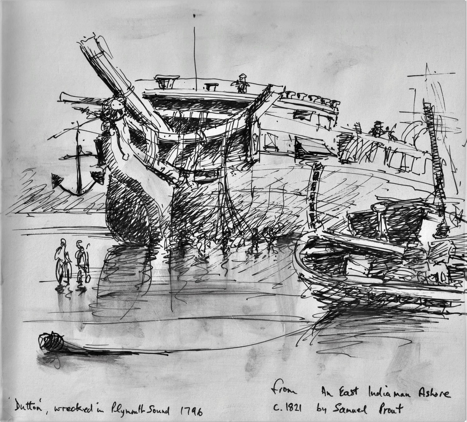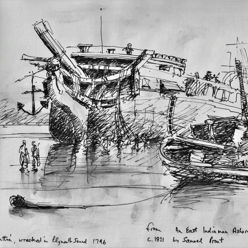 I drew this from an old oil painting I found in the library at Farnham, Surrey. Such an unusual painting of the end of a magnificent 18th century fighting ship.