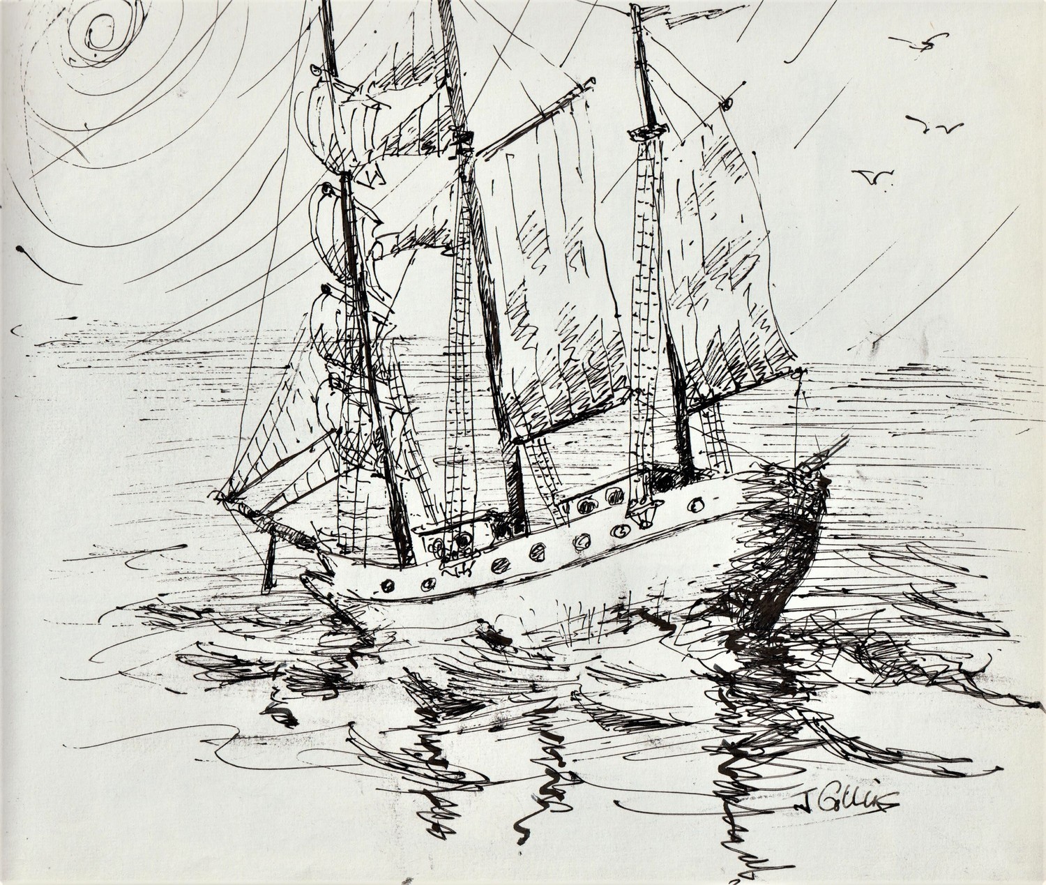 The sun setting on a yacht of indeterminate age. Actually I drew this from a model I had on my mantelpiece at the time, but I think it has a nice feel. Ink pen.