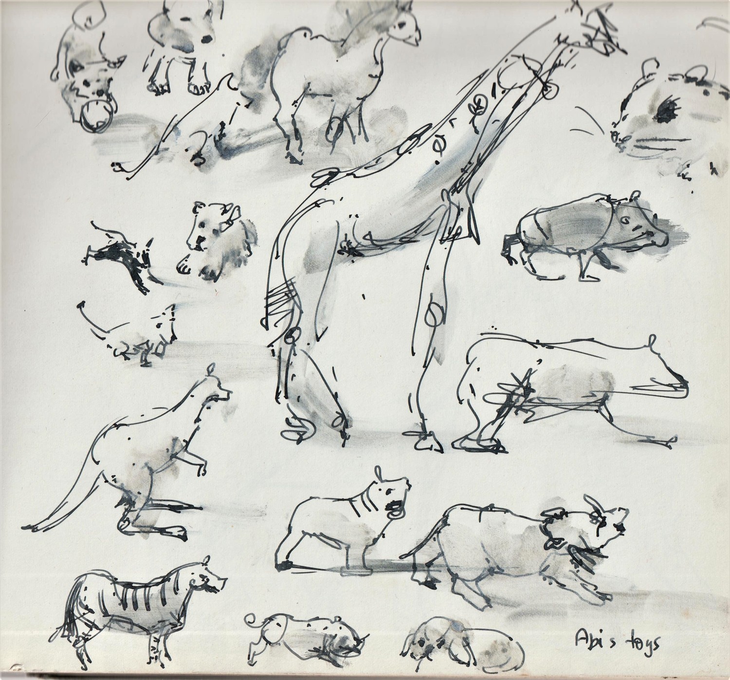 My daughter Abi's toys. She's twenty-six now and probably doesn't remember them, but I do. Ink pen and wash.