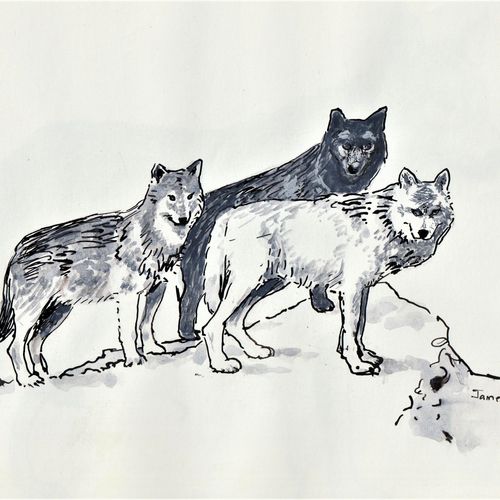 Three wolves. Pen and wash.