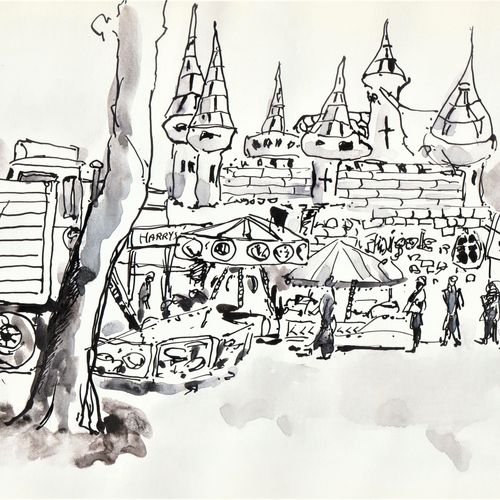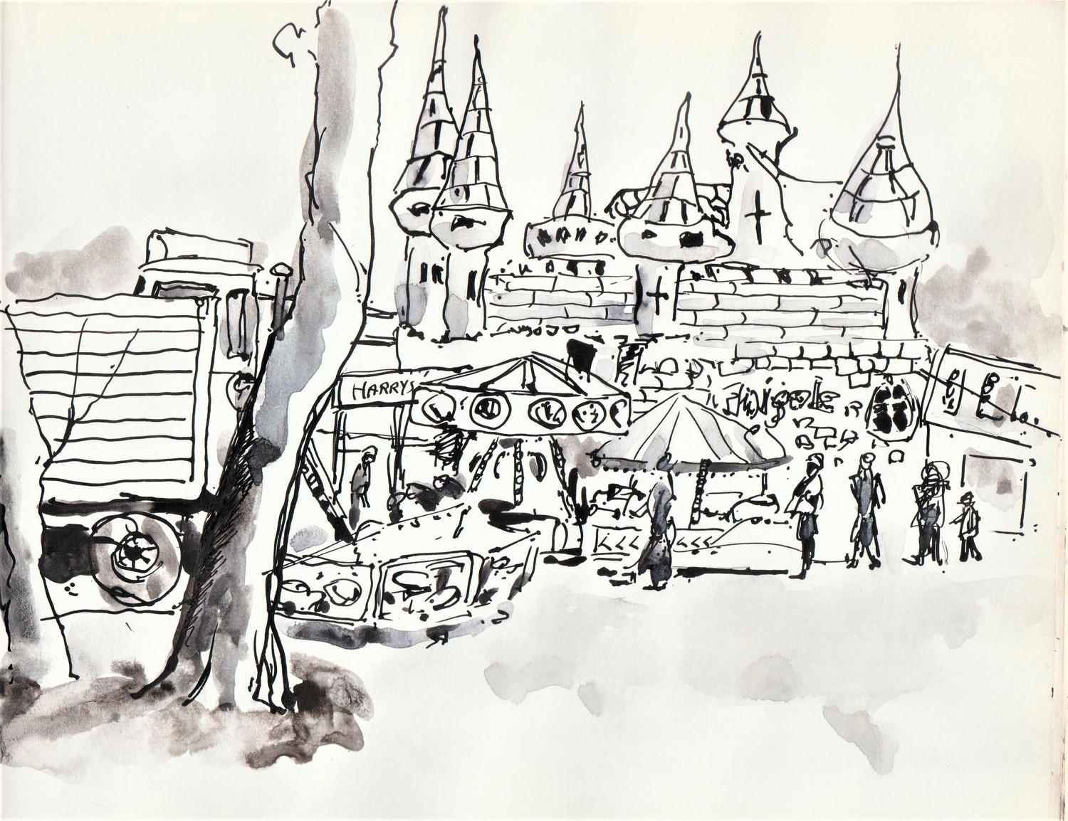 Traveling funfair at Forres, Moray, known locally as 'the showies'. When I looked up from drawing this, the whole castle had been deflated. That's show business for you. Pen and wash.